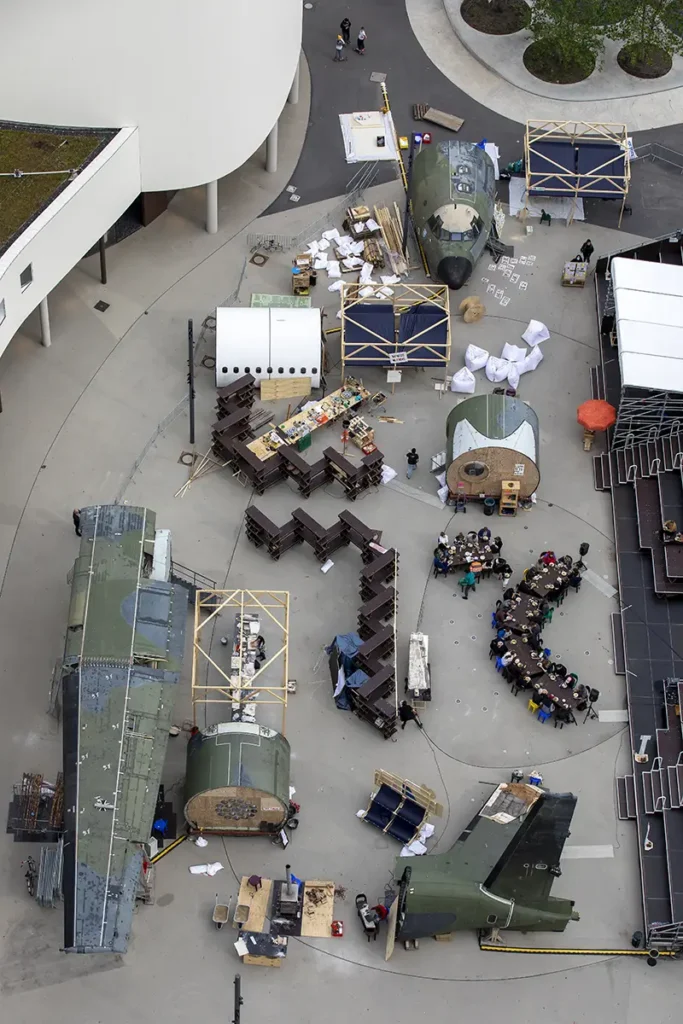 raumlabor fonctionne comme un groupe d’environ 20 personnes, avec un noyau de neuf partenaires de longue date. La collaboration est au centre de leur éthique de travail, poussant le studio à réfléchir, développer et agir ensemble, tant en interne qu’avec des amis, experts, collaborateurs locaux, agents, constructeurs, activistes et autres dans des sphères collectives multifacettes.